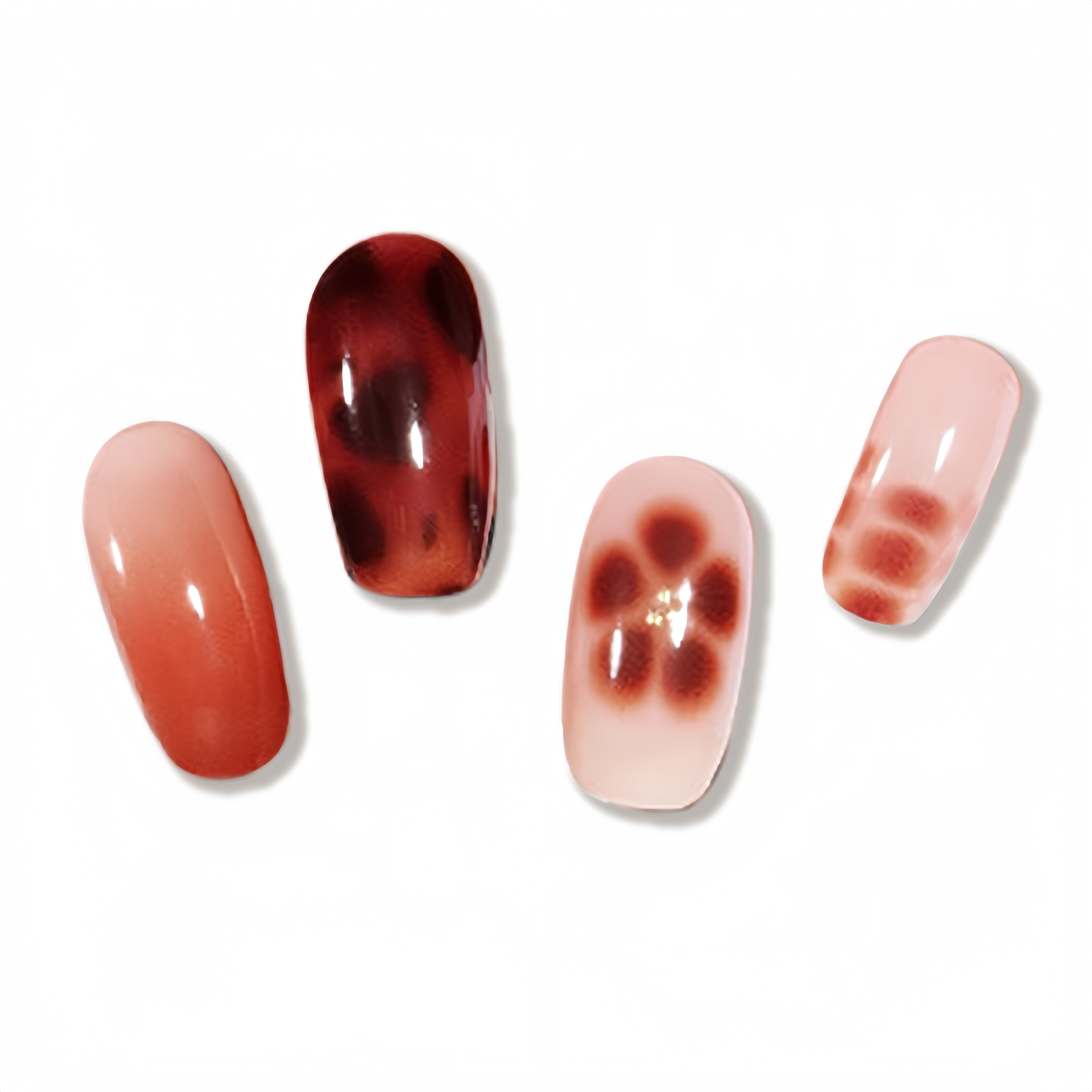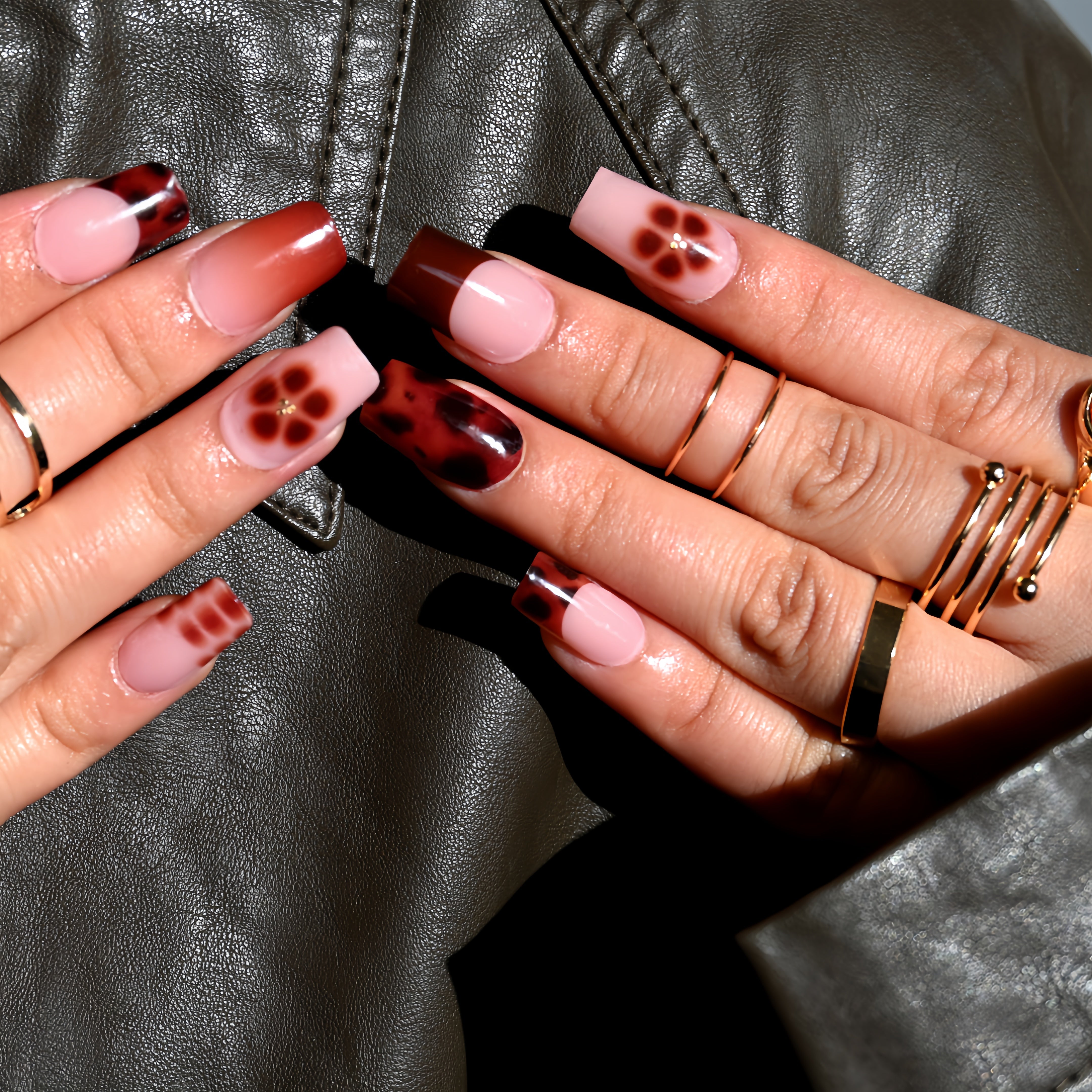 A tortoiseshell manicure that glows with the warmth of amber. This sunlit design is sprinkled with cheerful hibiscus blooms, framed by clean French tips. The playful yet polished look feels like a seaside escape—effortlessly chic, quietly vibrant, and full of vacation elegance.