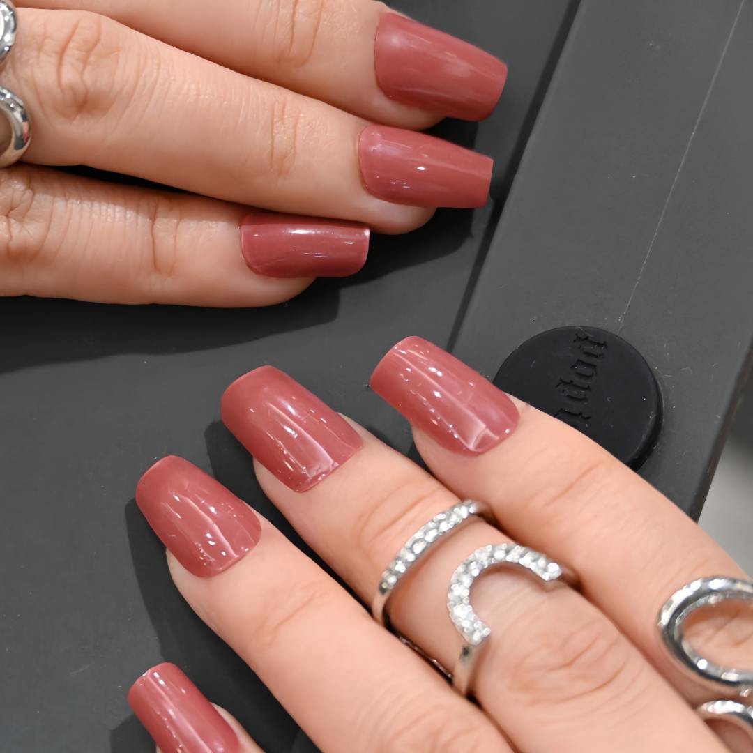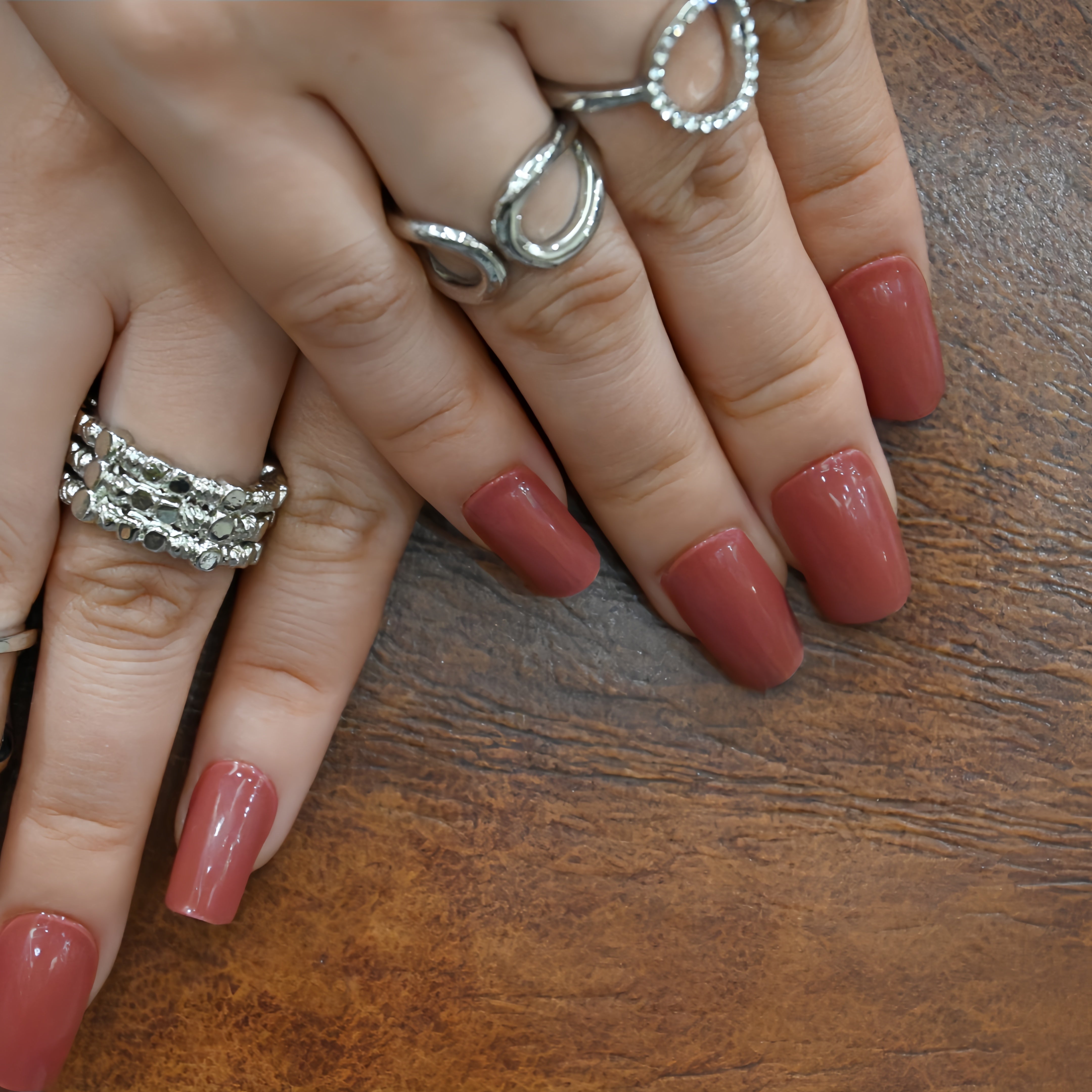 A warm cinnamon brick red that wraps your nails in cozy elegance! This rich, earthy shade delivers a smooth, full-coverage finish with a gentle glossy glow. The velvety UV-gel texture creates a sophisticated and warm statement, perfect for adding a touch of refined, autumnal charm to your style.