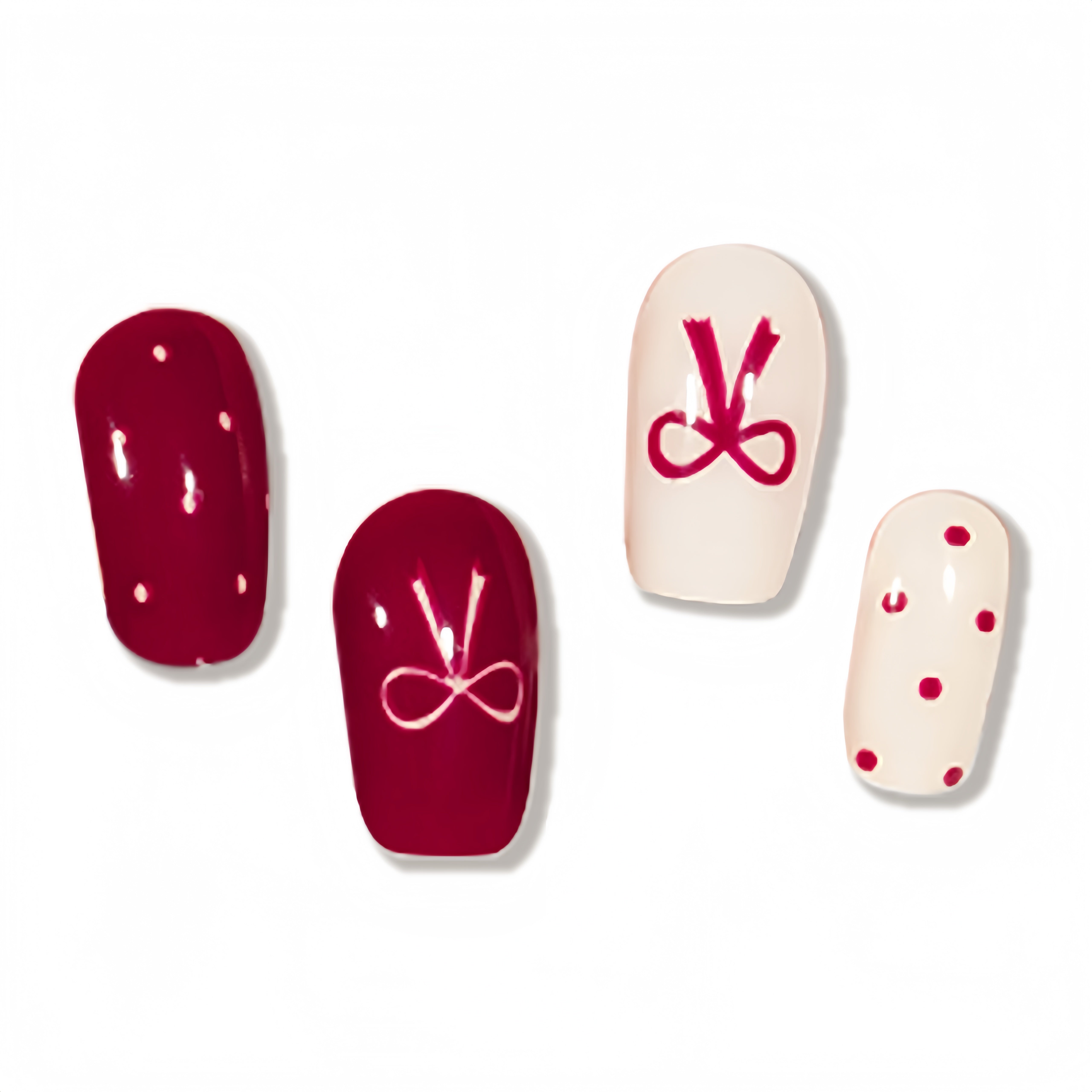 A sweet, speckled pink and crisp white manicure, tied together with a bow charm! This adorable UV-gel design combines playful dot detailing over a classic white or passionate red base. The flat-lay art creates a charming, romantic look perfect for Valentine's sweetness.