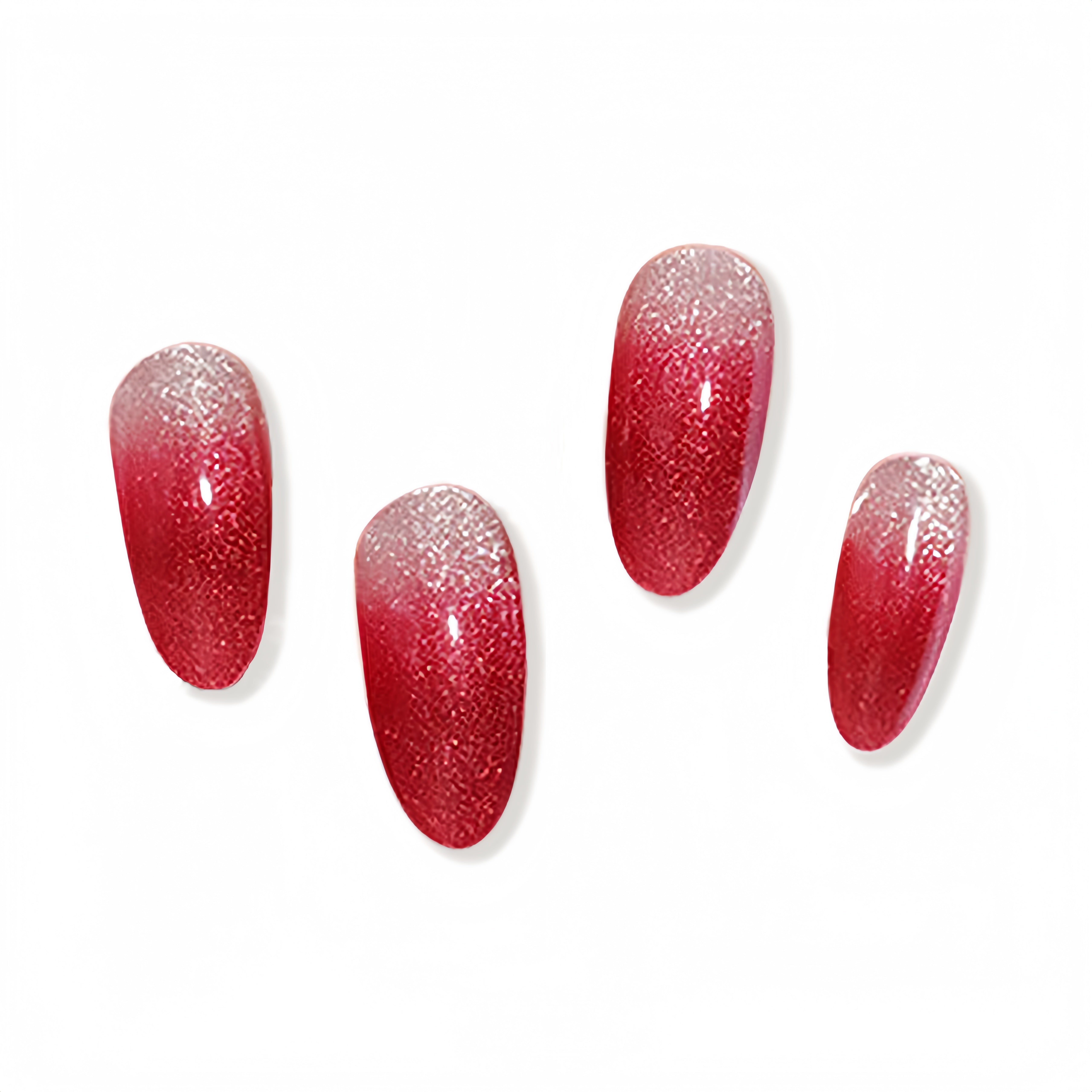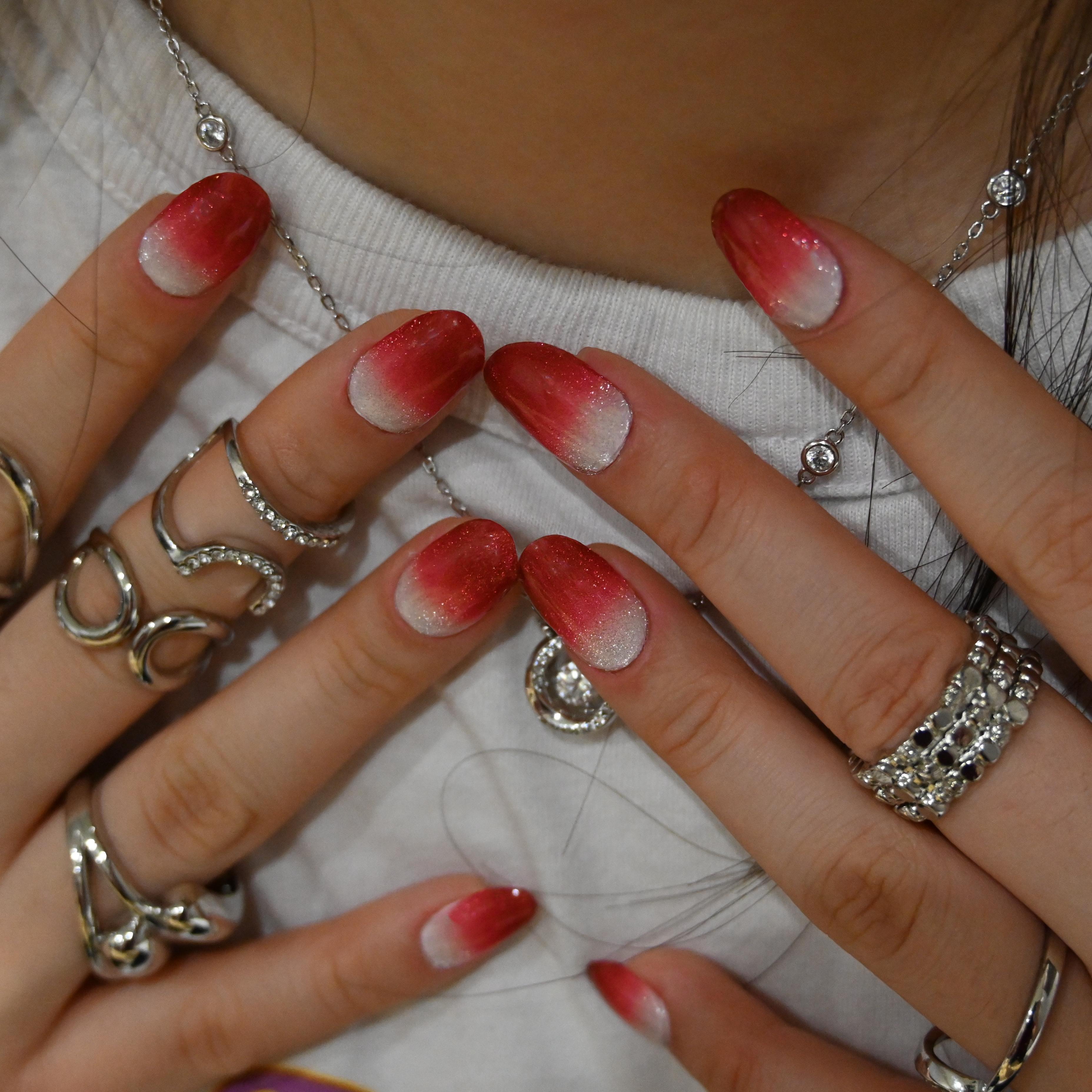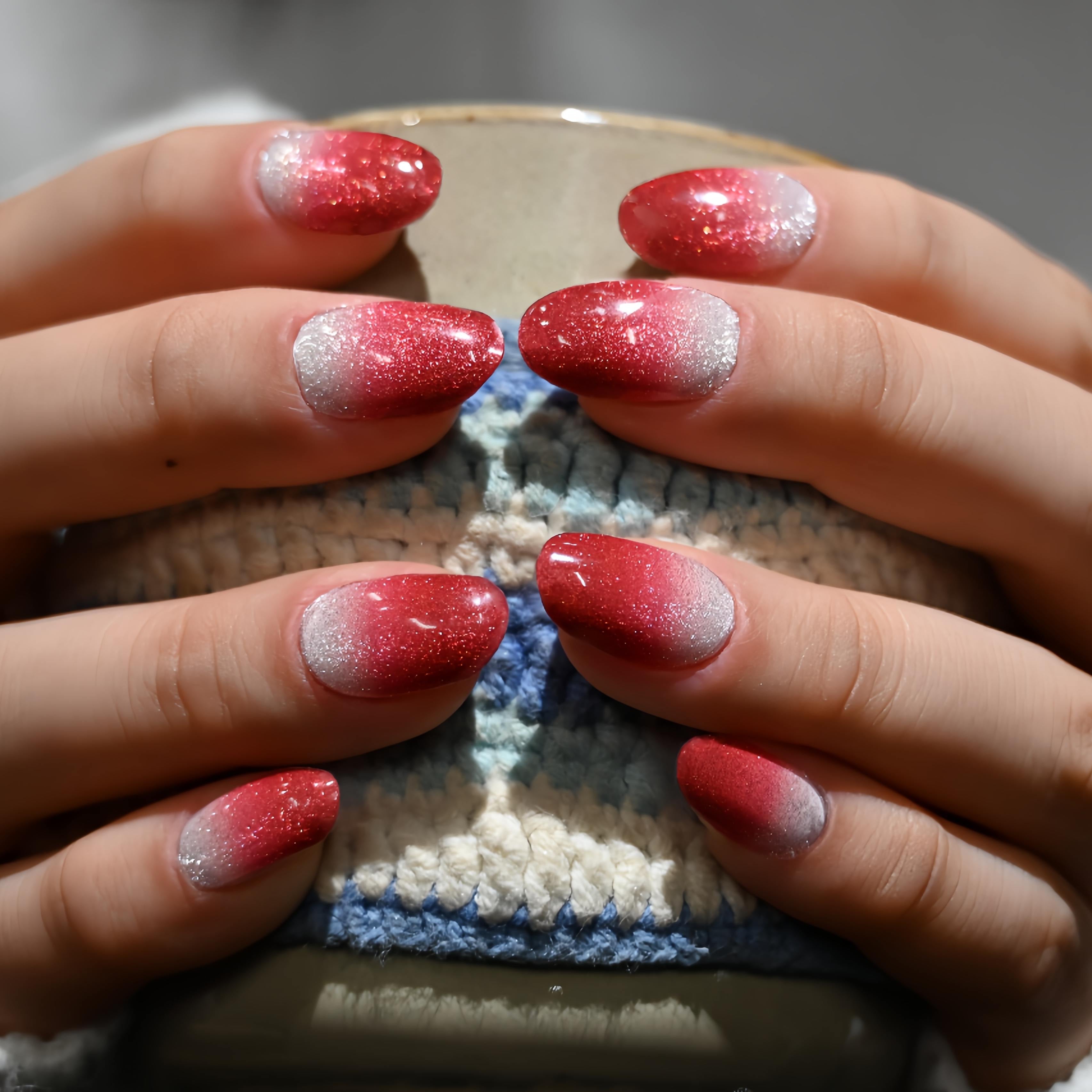 A shimmering silver that melts into a deep, festive burgundy! This mesmerizing UV-gel design shifts with a magnetic cat-eye glow, capturing light like a starry winter night. The rich gradient and luminous finish create a look of luxurious celebration—perfect for wrapping your tips in holiday magic.
