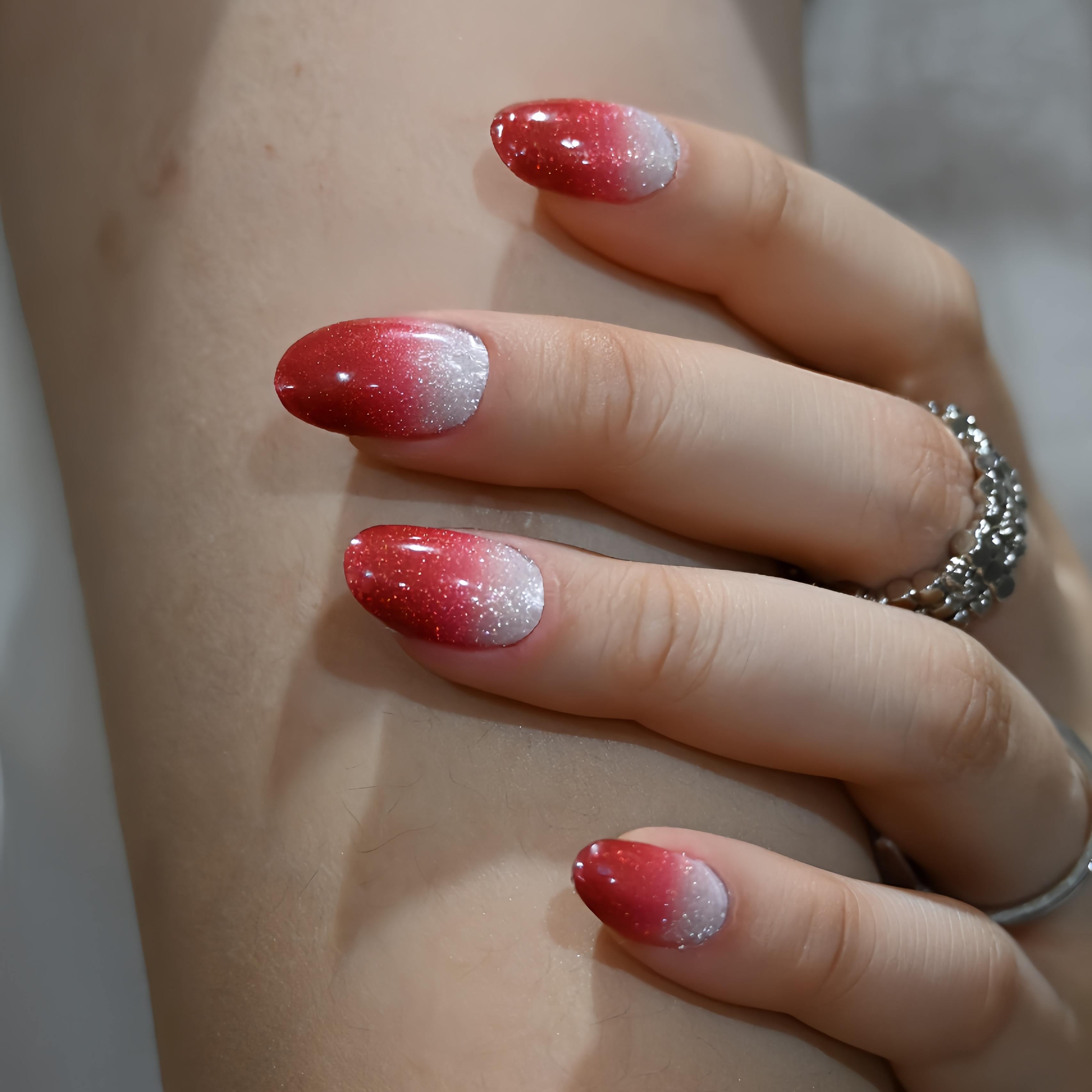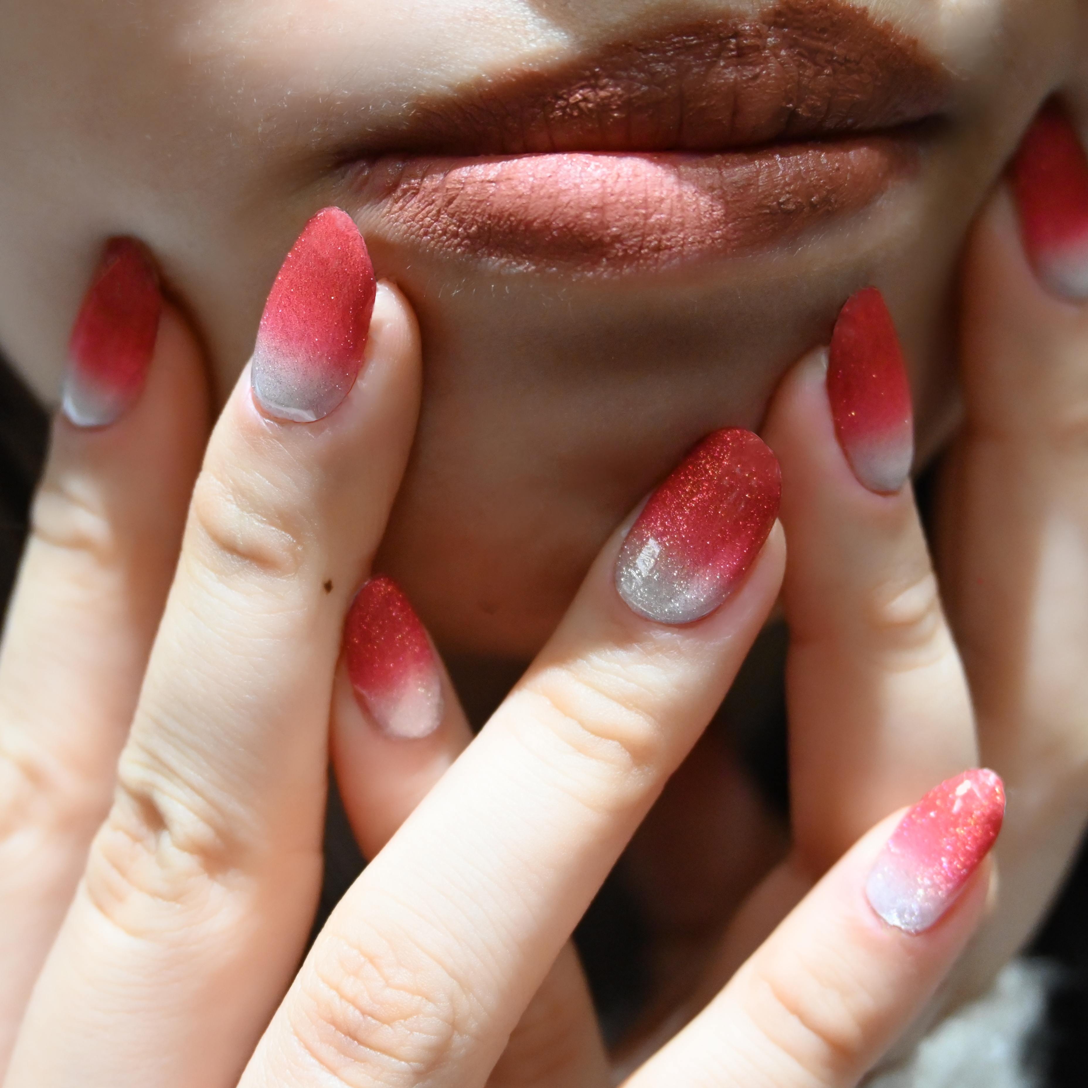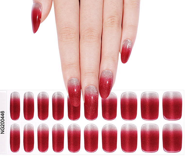 A shimmering silver that melts into a deep, festive burgundy! This mesmerizing UV-gel design shifts with a magnetic cat-eye glow, capturing light like a starry winter night. The rich gradient and luminous finish create a look of luxurious celebration—perfect for wrapping your tips in holiday magic.