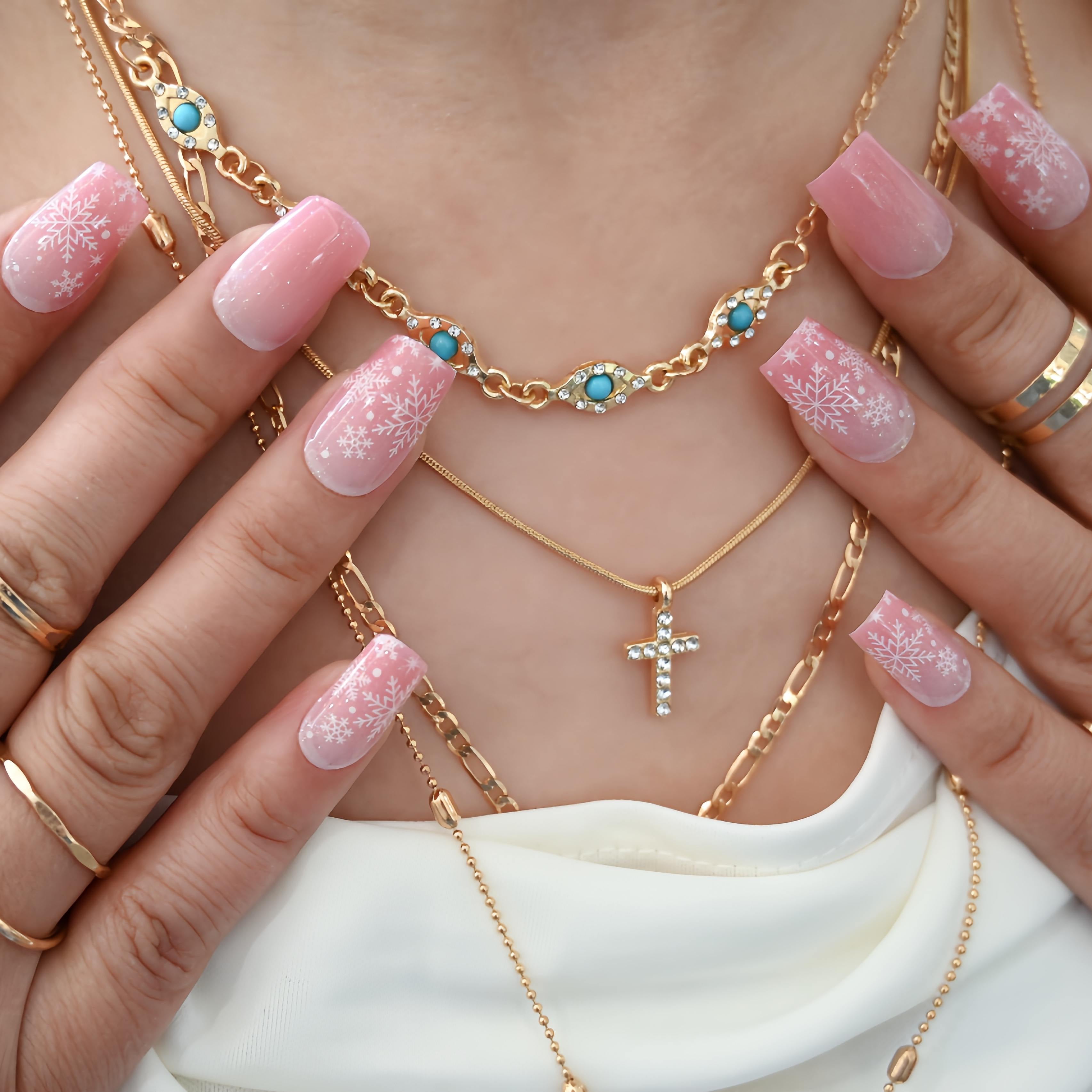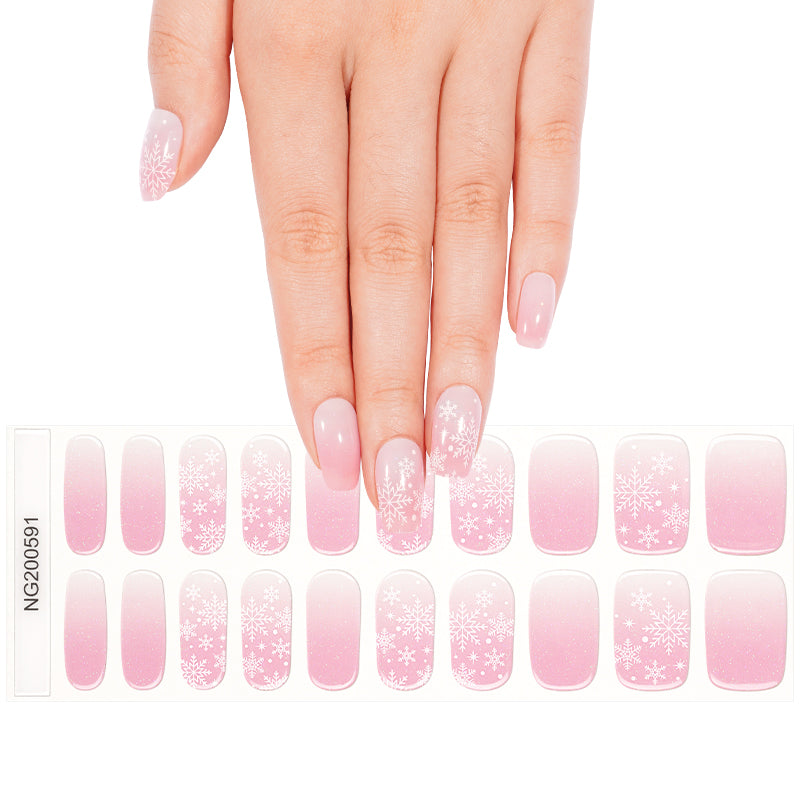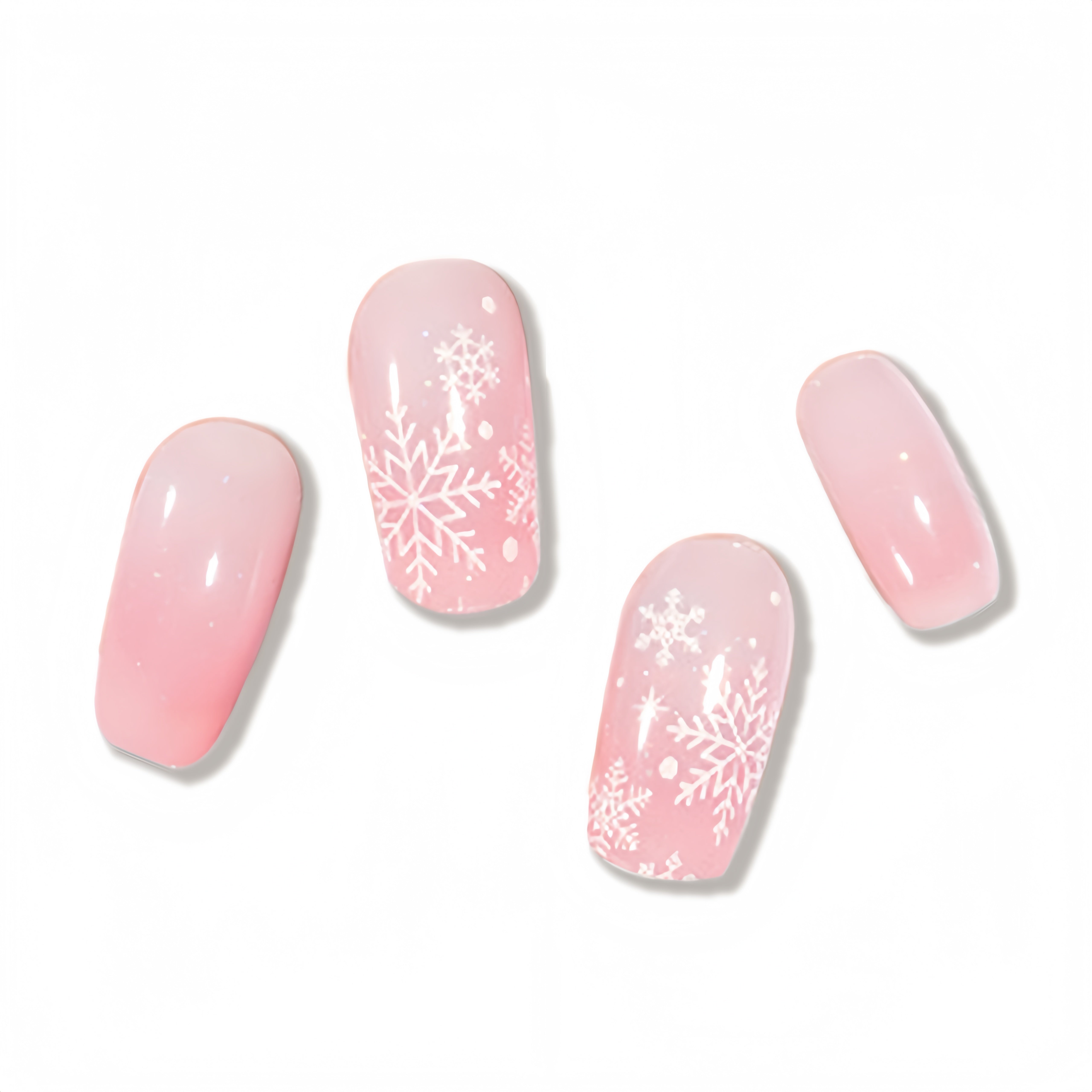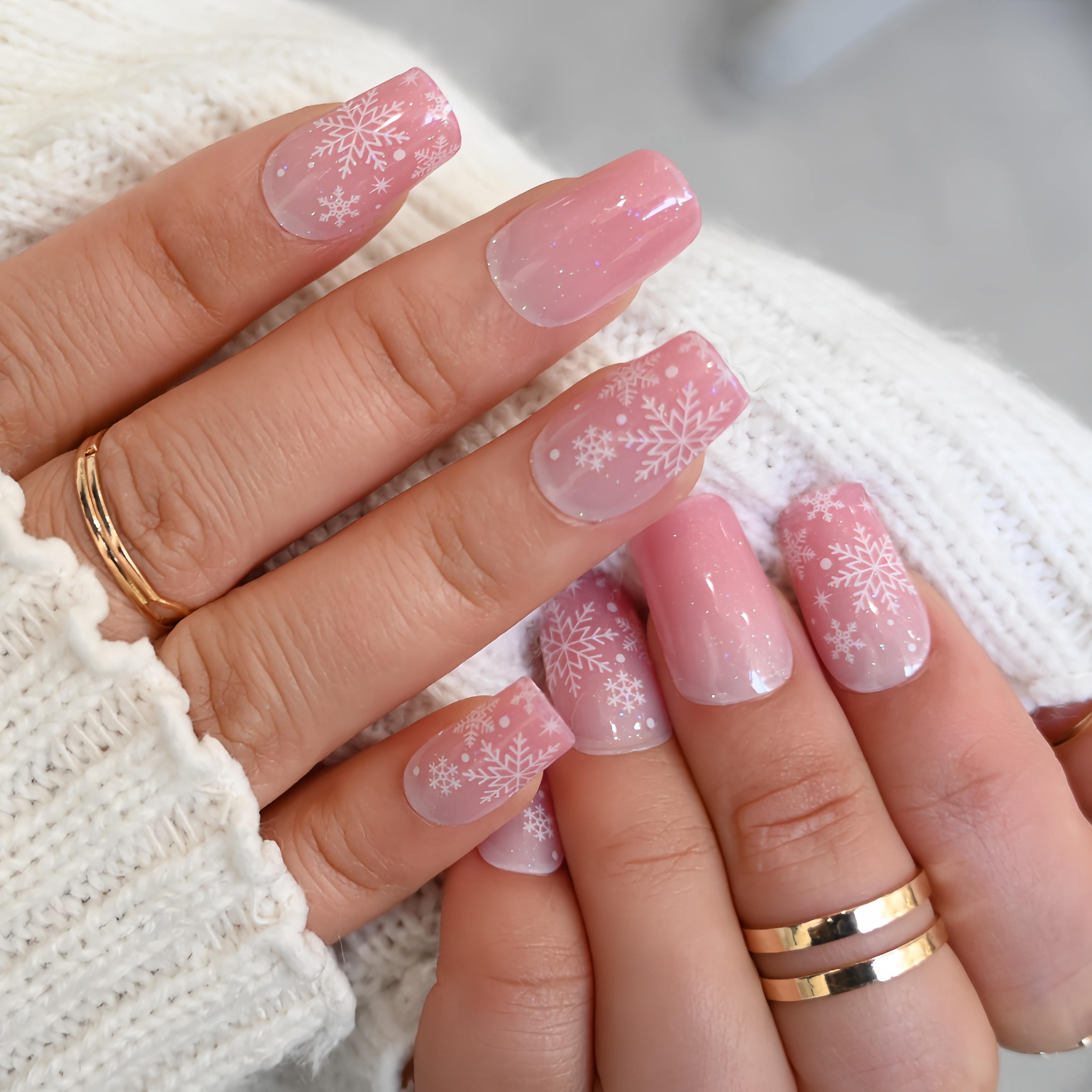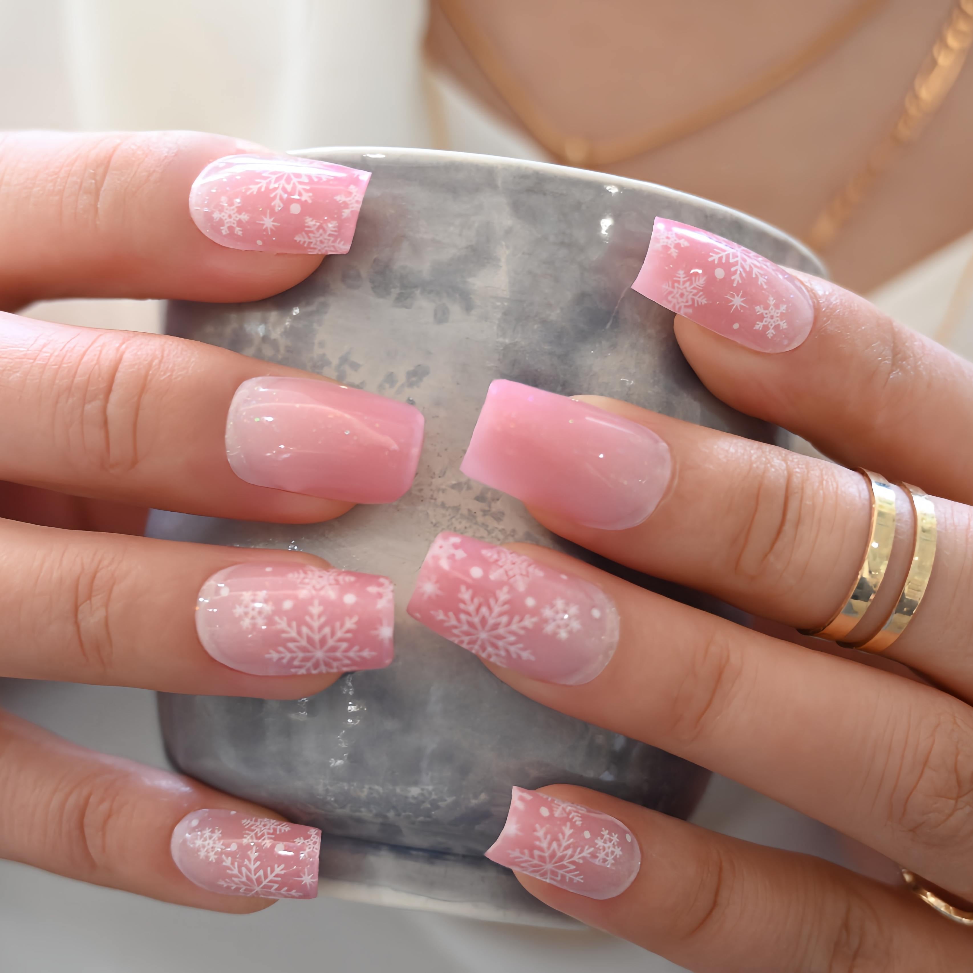 A sweet sugar-pink base sparkling with frosted snowflakes! This charming UV-gel design shifts with a soft cat-eye glow, as if holiday lights are dancing across a cozy winter blush. The combination of whimsical patterns and luminous shine creates a playful, festive look—perfect for a pink and pretty Christmas vibe.