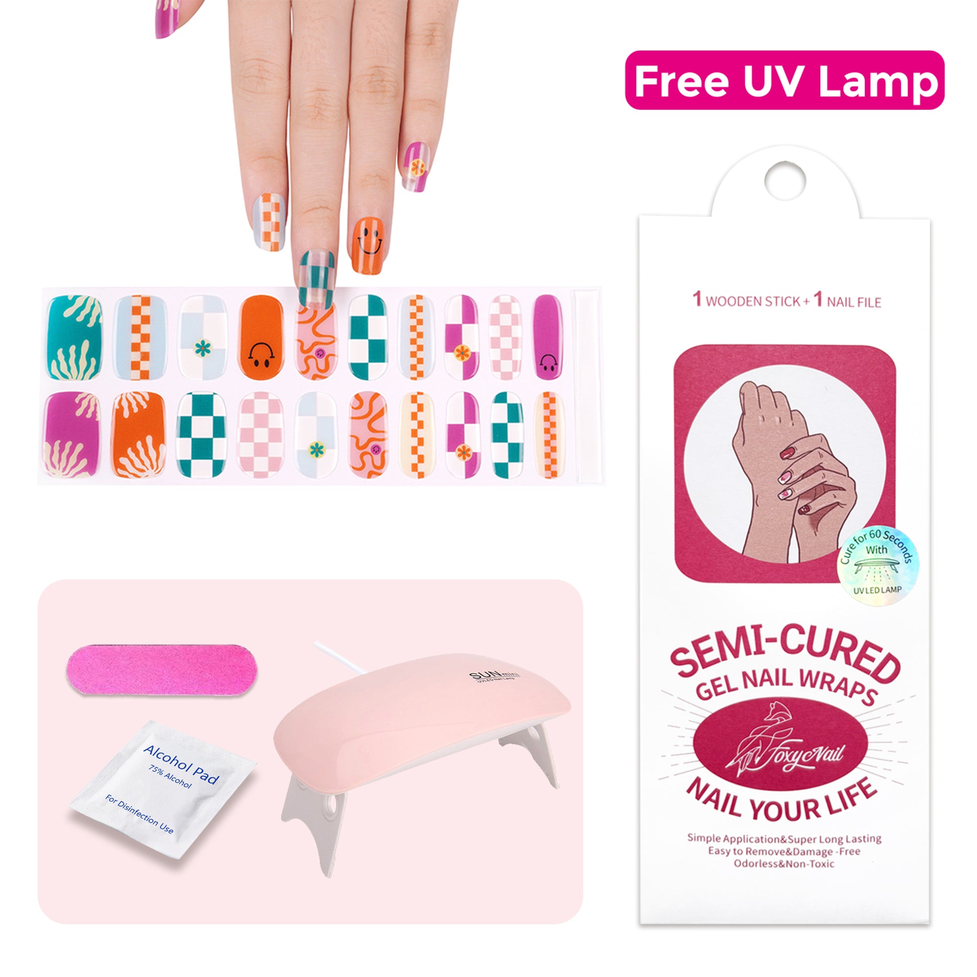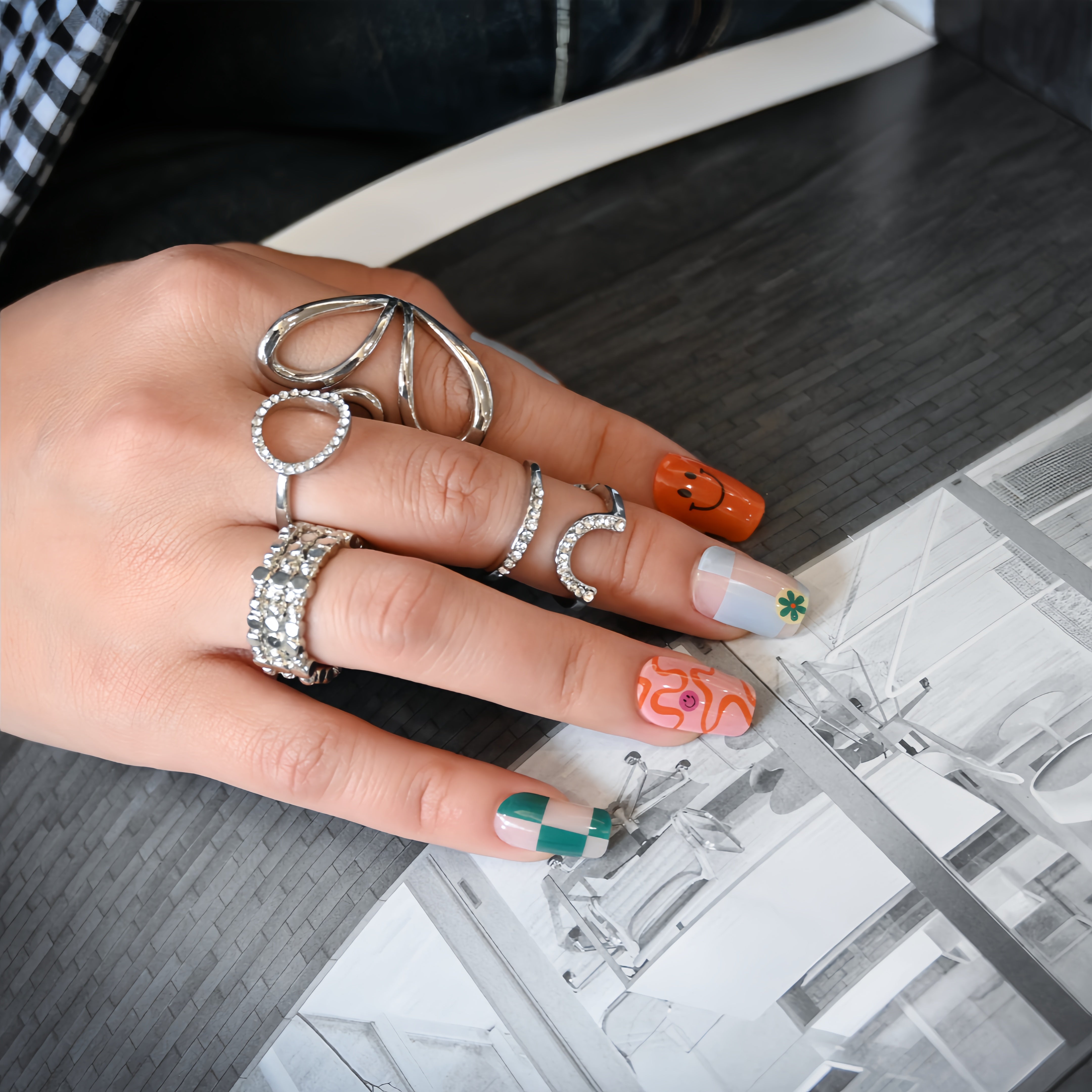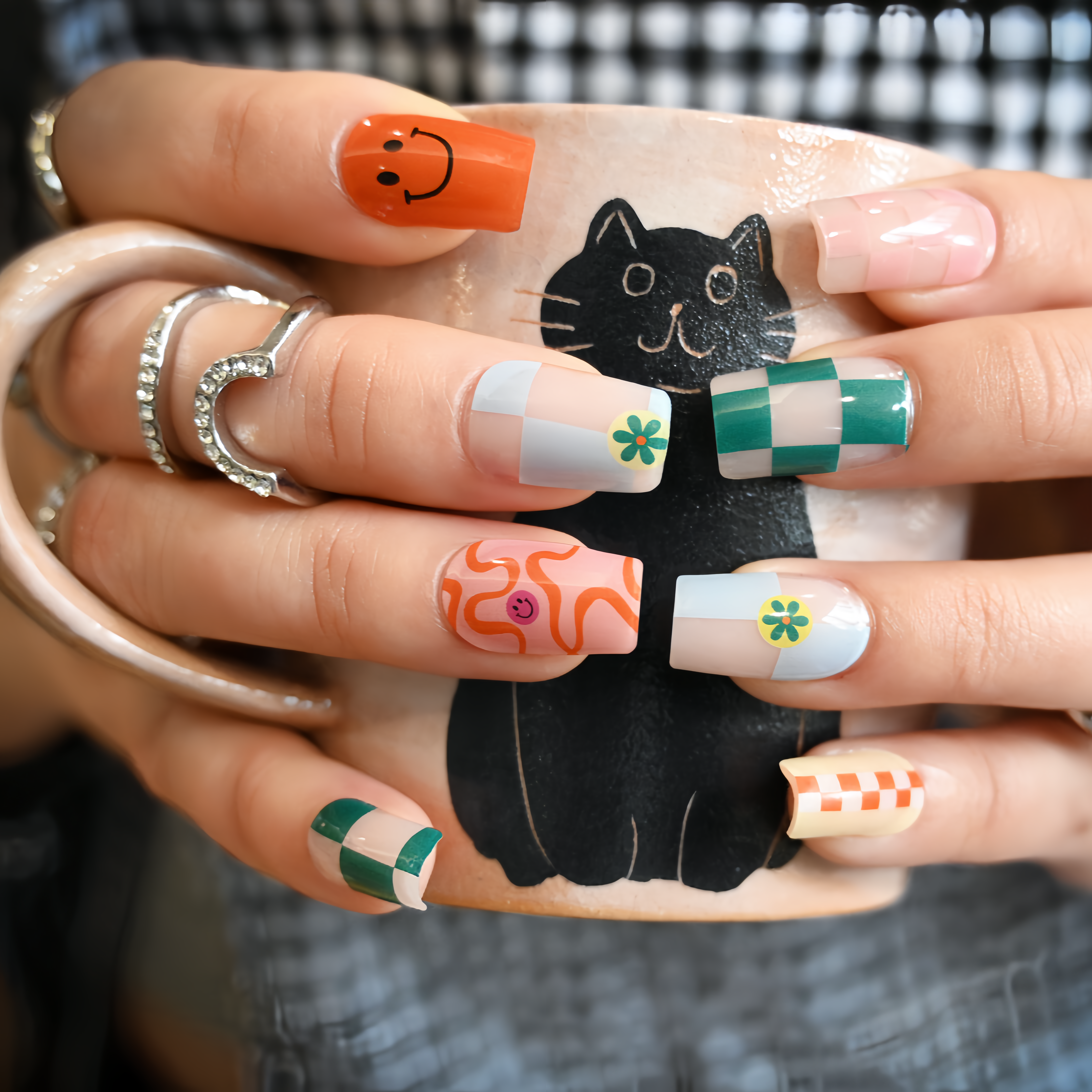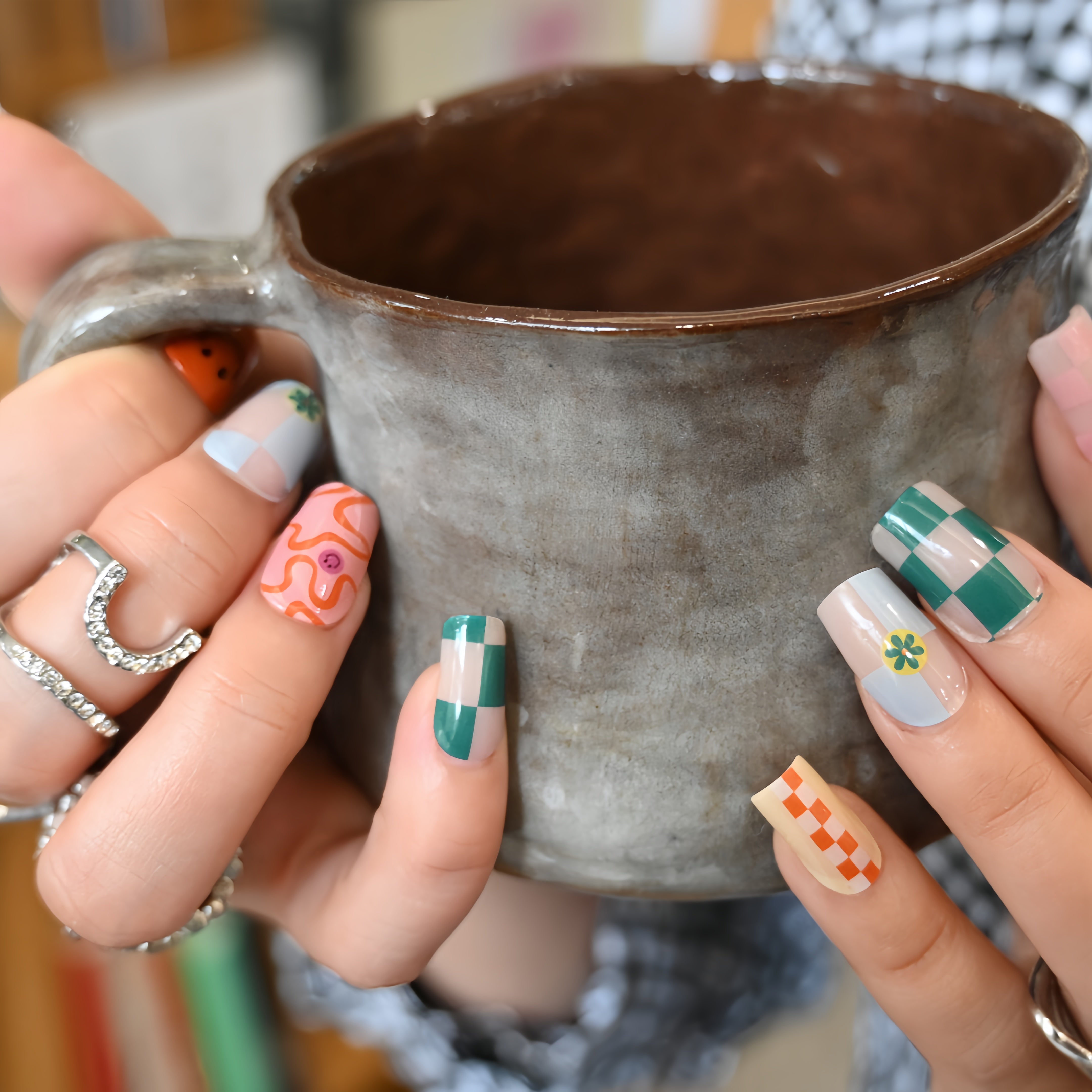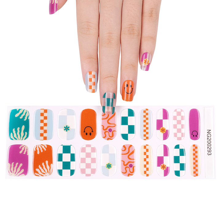 A playful burst of crayon-box colors at your fingertips! This cheerful manicure mixes crisp green gingham with a sunny orange and sky-blue check, topped with a grinning citrus smile. The whimsical patterns dance across glossy UV-gel, creating a look that’s sweet, spirited, and wonderfully fun.