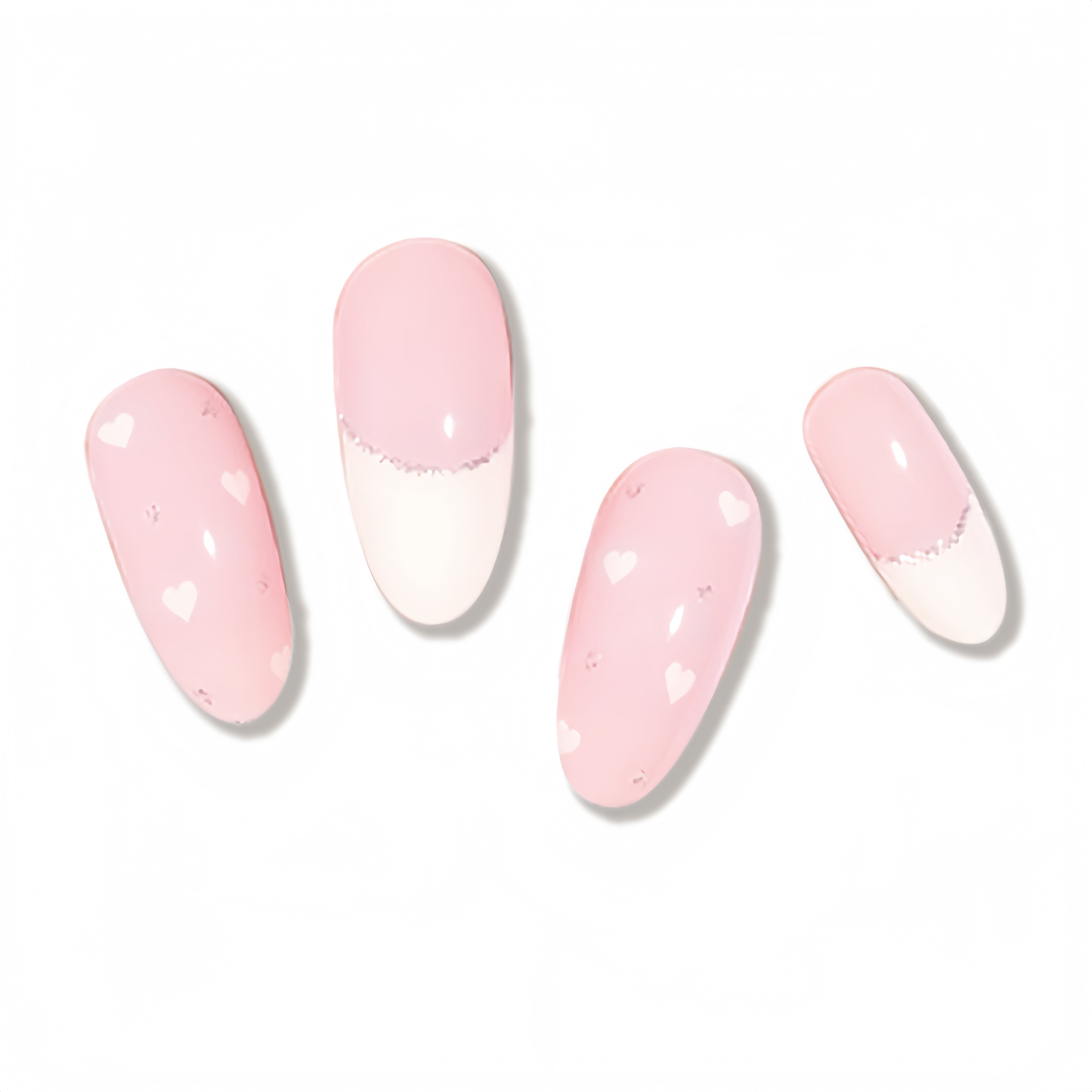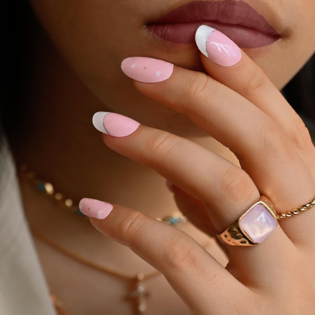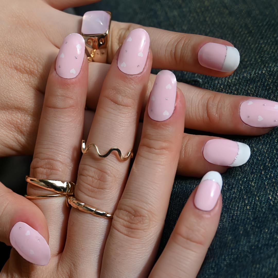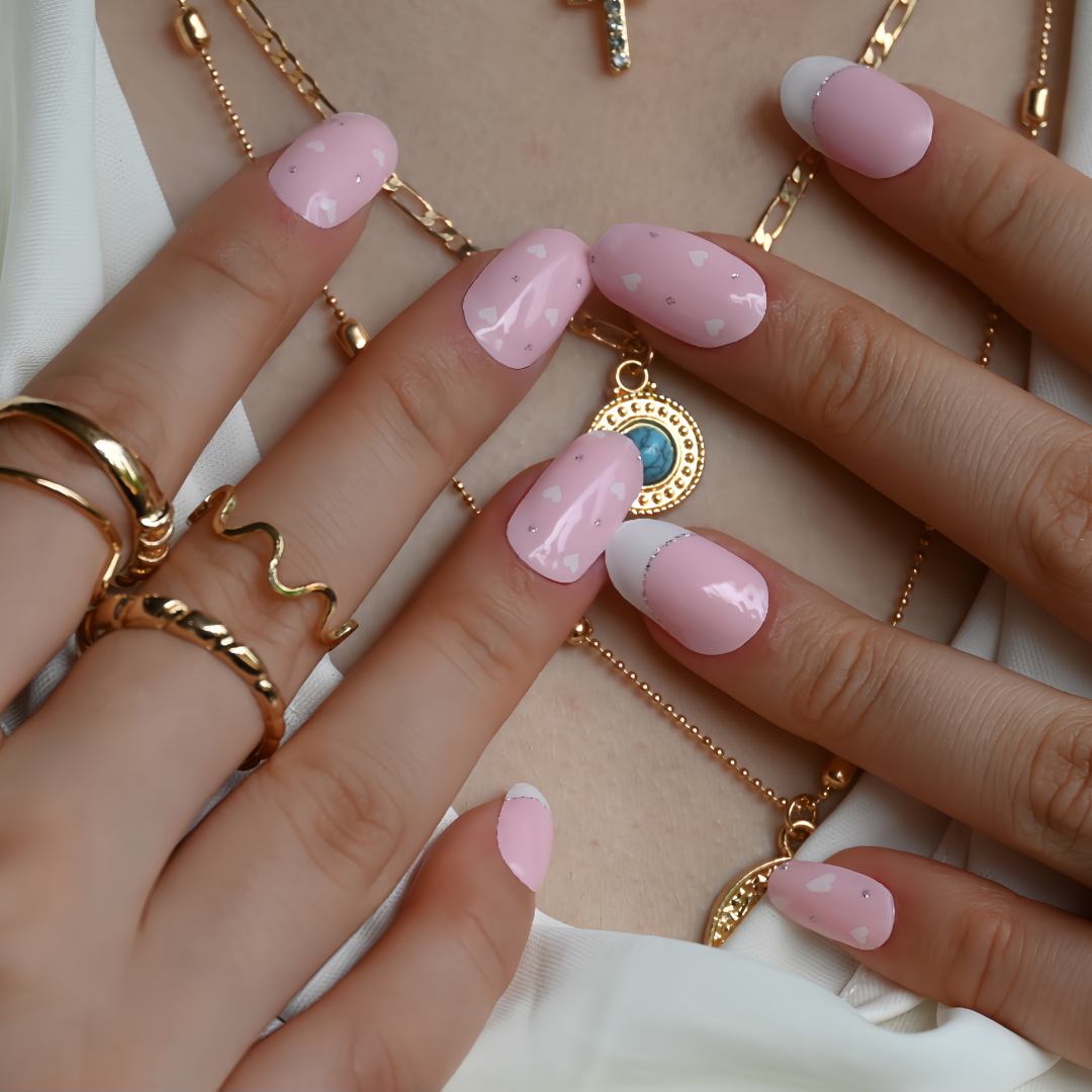 A blush-pink and crisp white French manicure, delicately scattered with tiny white hearts! This sweet design combines a soft, romantic base with clean tips and playful love-themed details. The look is tender, polished, and perfectly charming—a gentle Valentine’s Day whisper at your fingertips.